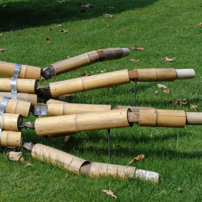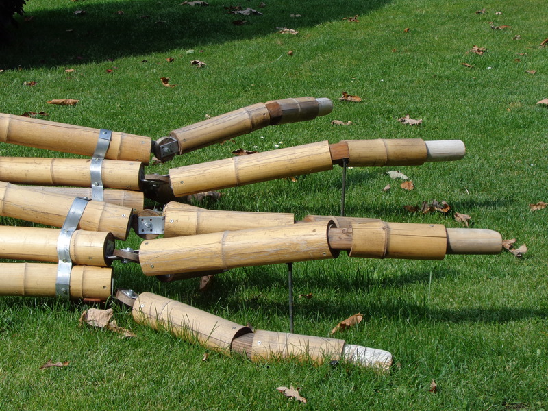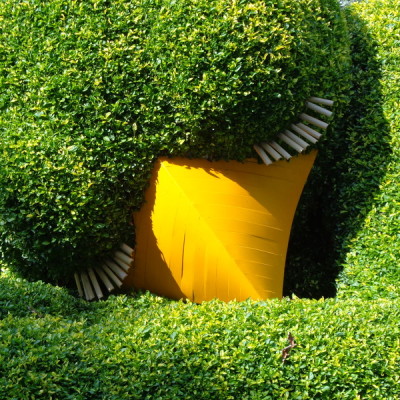 Le corps et la tête du poussin sont composés de végétaux vivants plantés sur une structure grillagée. Le bec, les pattes et les accessoires de la valise sont en contreplaqué, bambous, bois et zinc.
