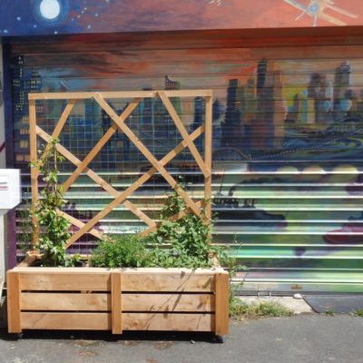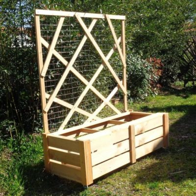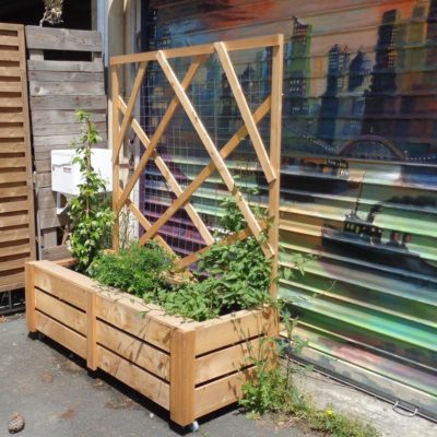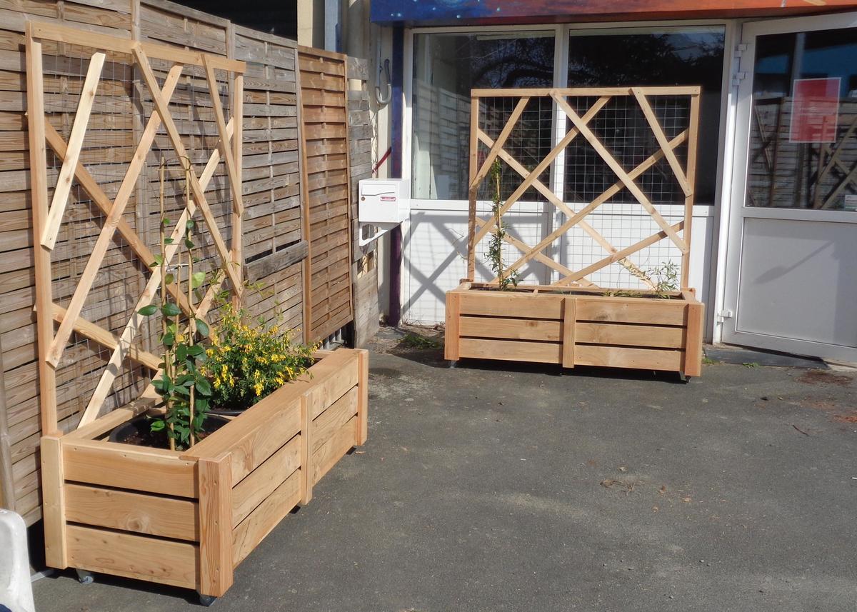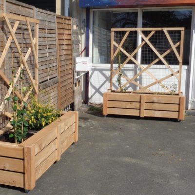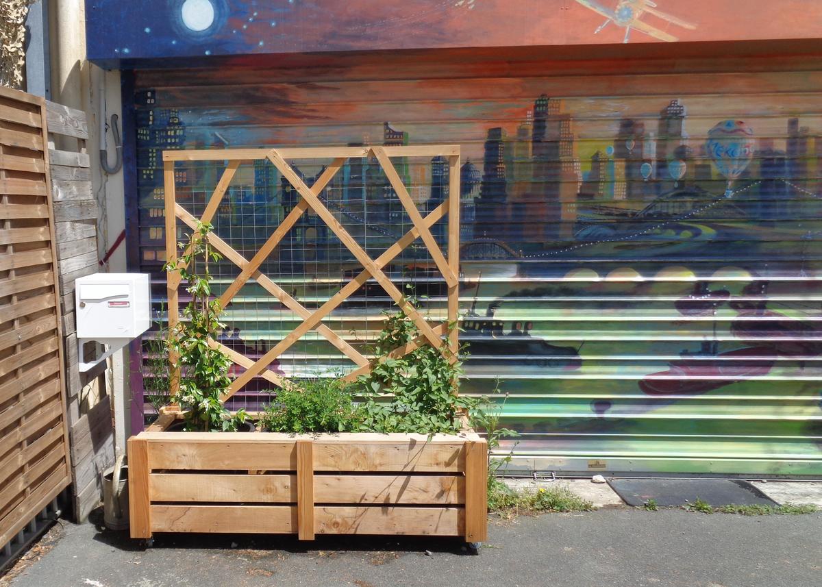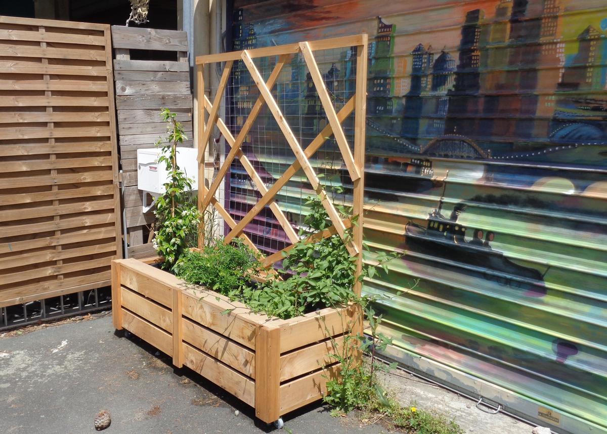 Les bacs à plantes disposent de roulettes pour être déplacés selon les configurations choisies. Leur hauteur permet de s'y asseoir. Un panneau arrière grillagé sert de support aux plantes grimpantes et deviendra ainsi palissade pour créer de l'intimité ou se protéger du vent et du soleil.