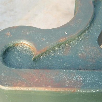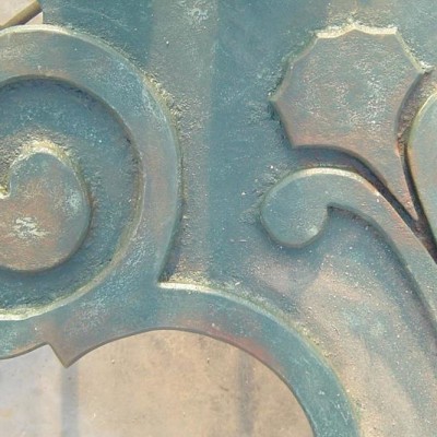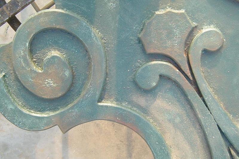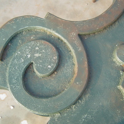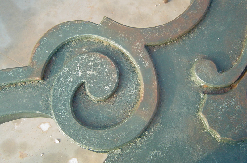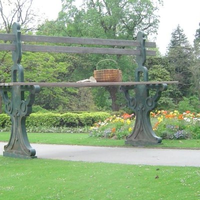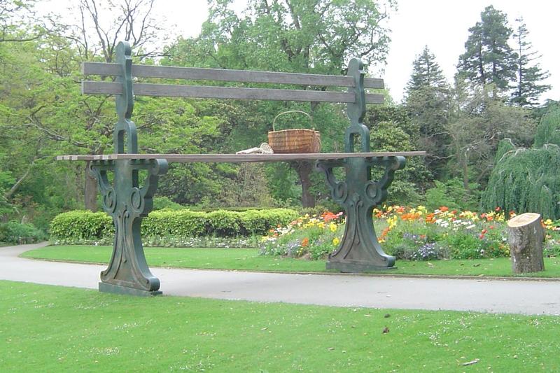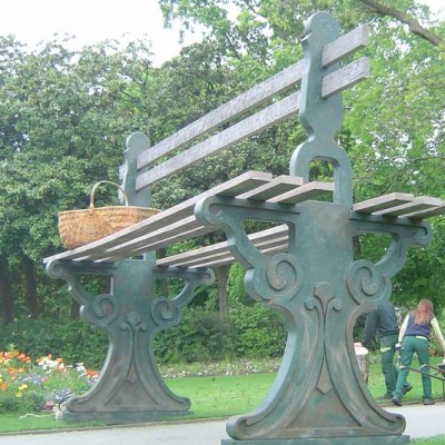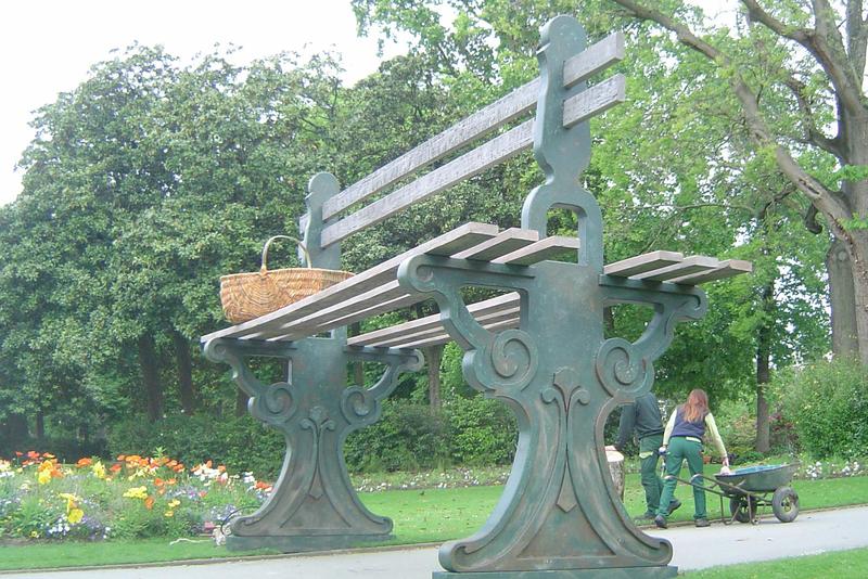 Le banc géant a été construit en bois. Le travail a ensuite consisté à maquiller les pieds pour faire croire à de la fonte vieillie et rouillée depuis plusieurs années. Il a fallu adapter les techniques de trucage des décors de cinéma ou de théâtre pour obtenir cet effet métal.