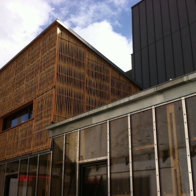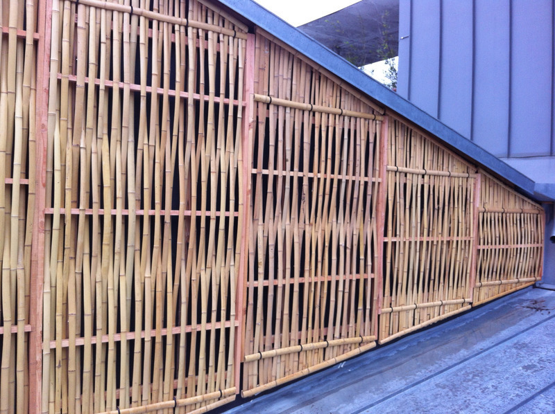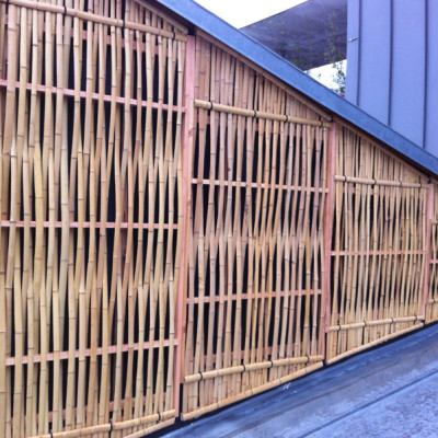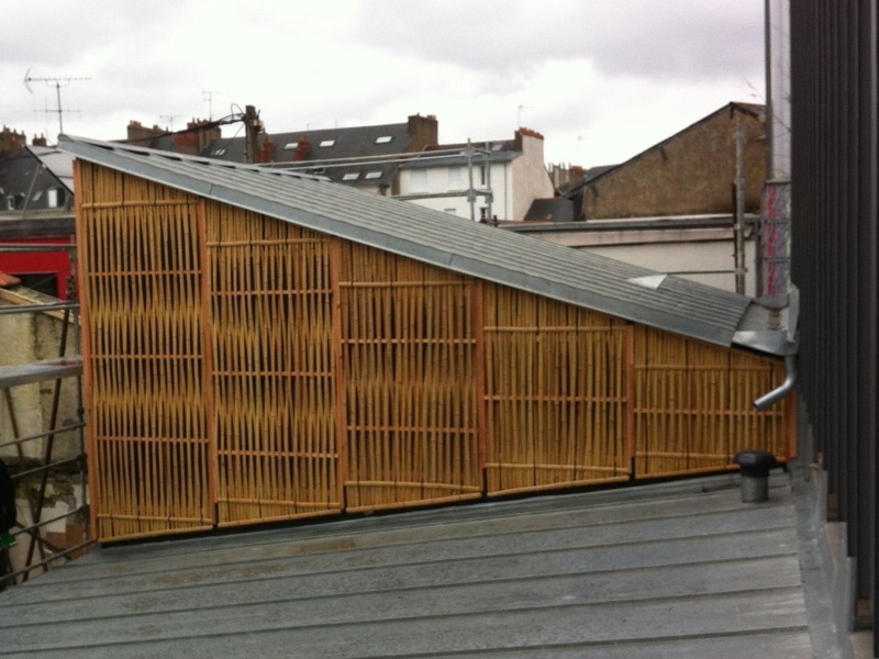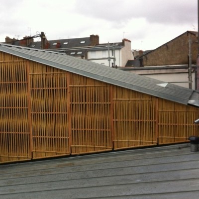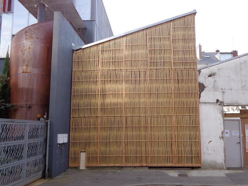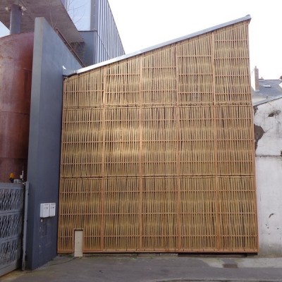 Dès le départ l'idée d'un tressage s'est imposée pour son aspect plus naturel et plus sauvage que la planche traditionnelle. Plusieurs solutions étaient possibles à base de perches de châtaignier ou de brins d'osier mais elles comportaient de sérieuses contraintes techniques ou financières. La latte de bambous s'est imposée pour sa légèreté, sa souplesse, sa mise en œuvre simplifiée et son aspect régulier sans être pour autant rectiligne. De plus, elle n'a pas besoin de traitement de protection.