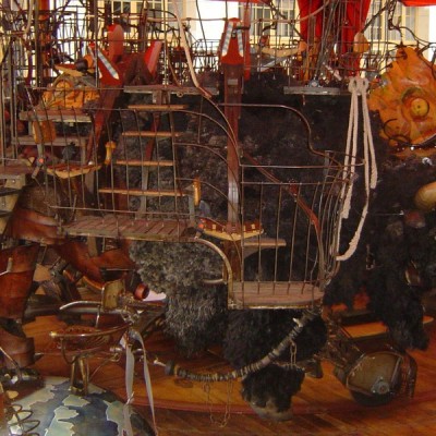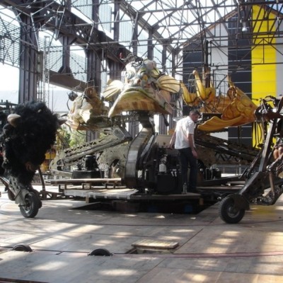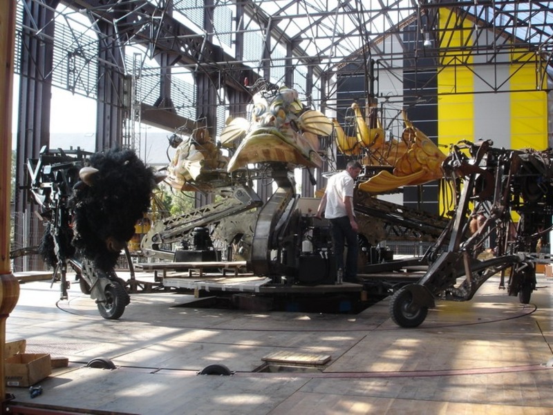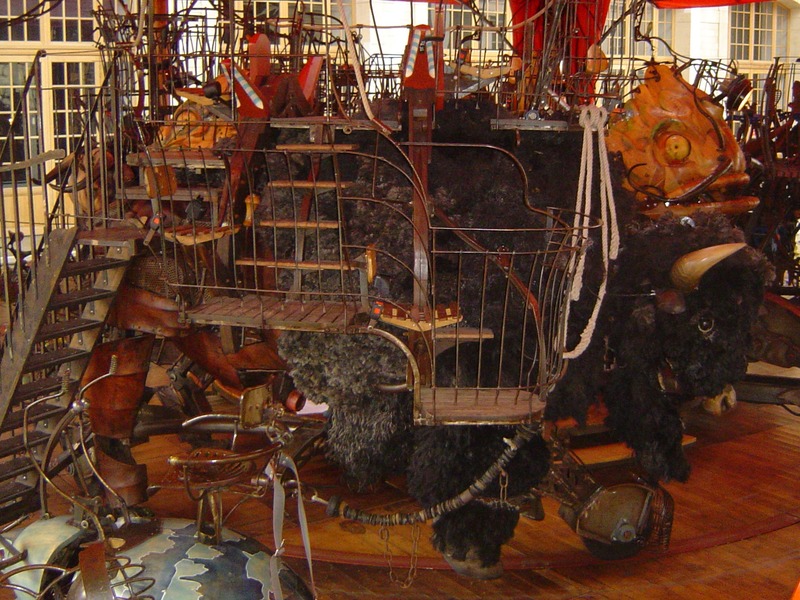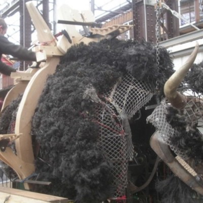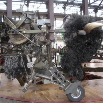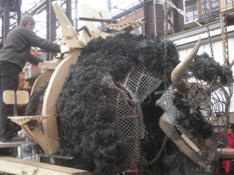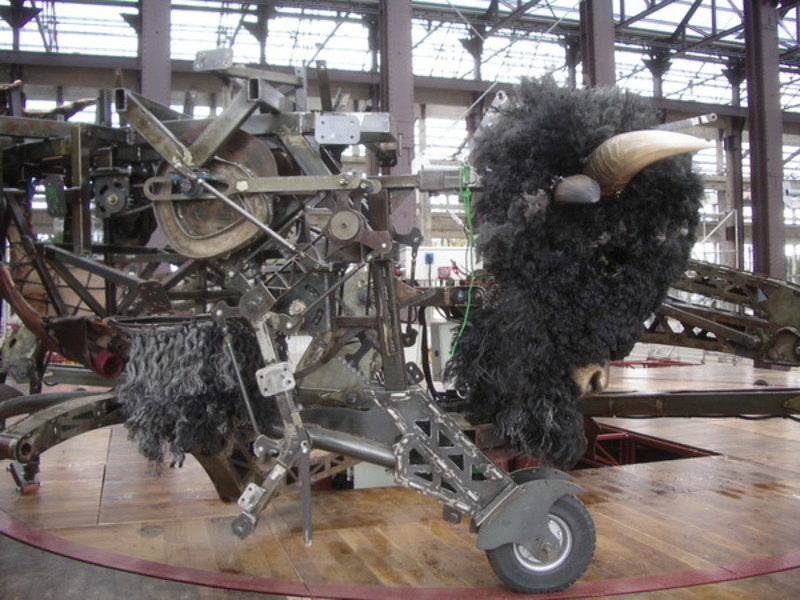 Une vingtaine d'animaux de toutes sortes manipulés par le public. Parmi eux, 3 buffles géants accueillant entre 6 et 8 personnes chacun. Dans le manège, ce sont eux qui tirent et font tourner le plateau géant, tels d'antiques bêtes de somme. Ils doivent donc inspirer la puissance, la force et aussi une certaine rusticité. Leur complémentarité se distingue par leur forme et les matériaux qui les composent. Le notre, inspiré du bison est fait de poils et de cuir. Il nous a fallu environ 6 mois de travail à 3 pour concevoir et construire la bête.