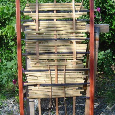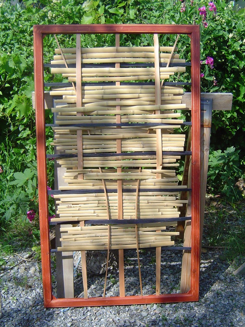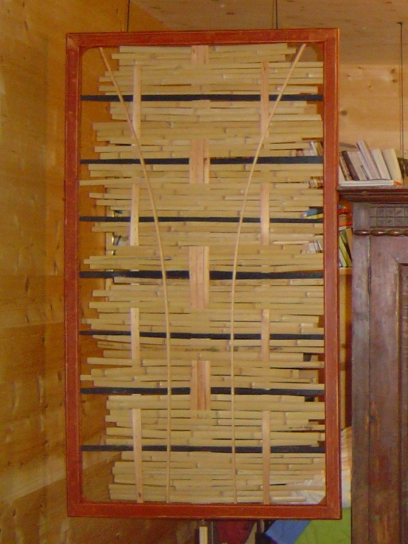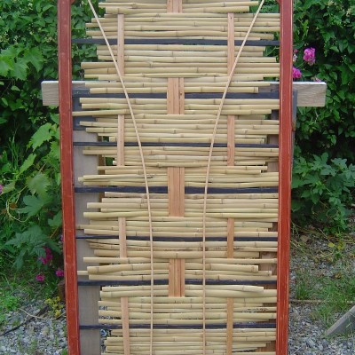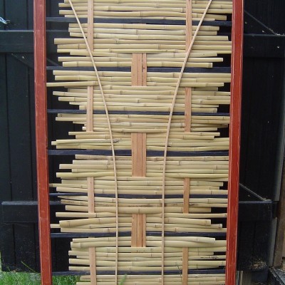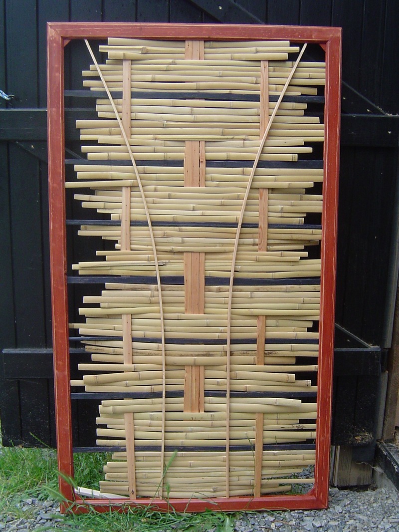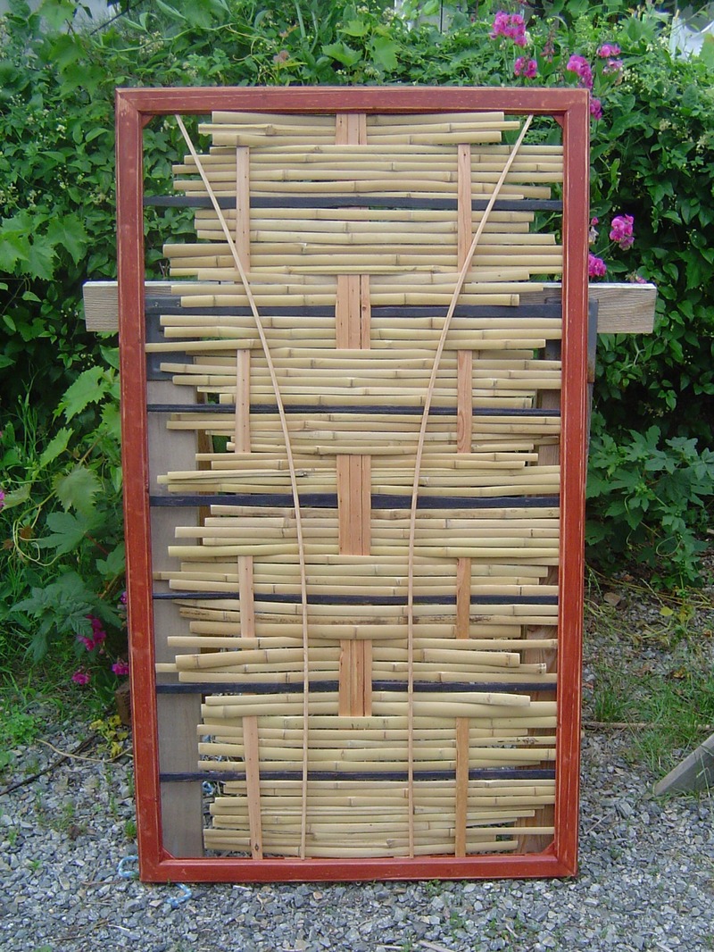 Deux panneaux mobiles en lames de bambous tressés pour cloisonner une pièce.