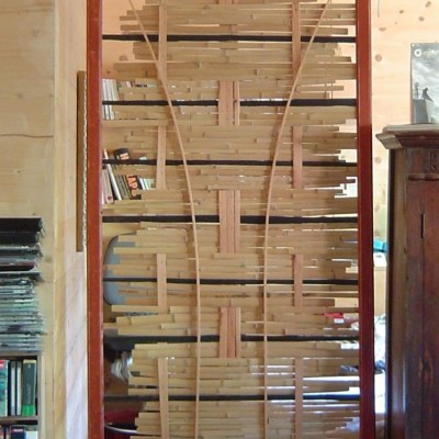 La barrière doit rester virtuelle pour ne pas confiner les 2 espaces. Les 2 panneaux à la structure aérée laissent passer la lumière et laissent malgré tout deviner ce qui est derrière quand on s'en approche. Ils rappellent les moucharabieh des pays arabes.