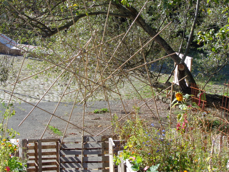 la construction d'un portail et d'une sculpture en bambous représentant un soleil suspendu dans la perspective Ouest du jardin