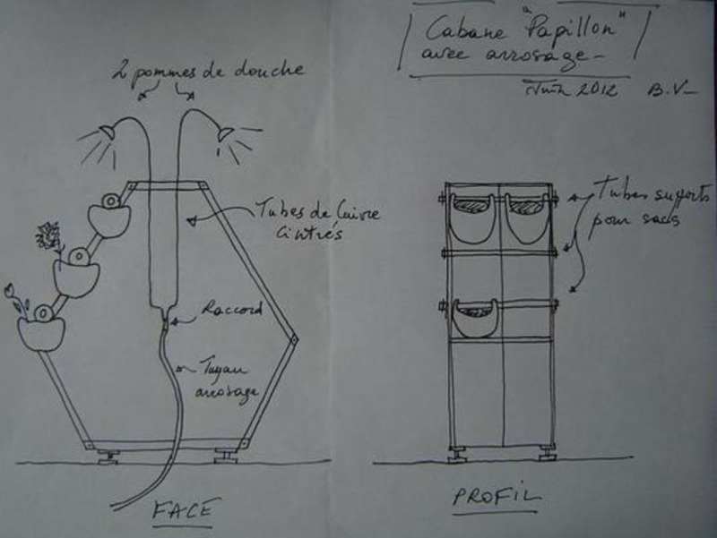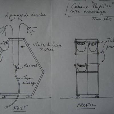 chercher une forme originale et ludique, inspirée du papillon, qui soit aussi une cabane à jouer, une structure à grimper, un totem à décorer, d'où l'idée d'intégrer un système d'arrosage sous la forme de deux antennes d'insectes permettant un effet "brumisateur".