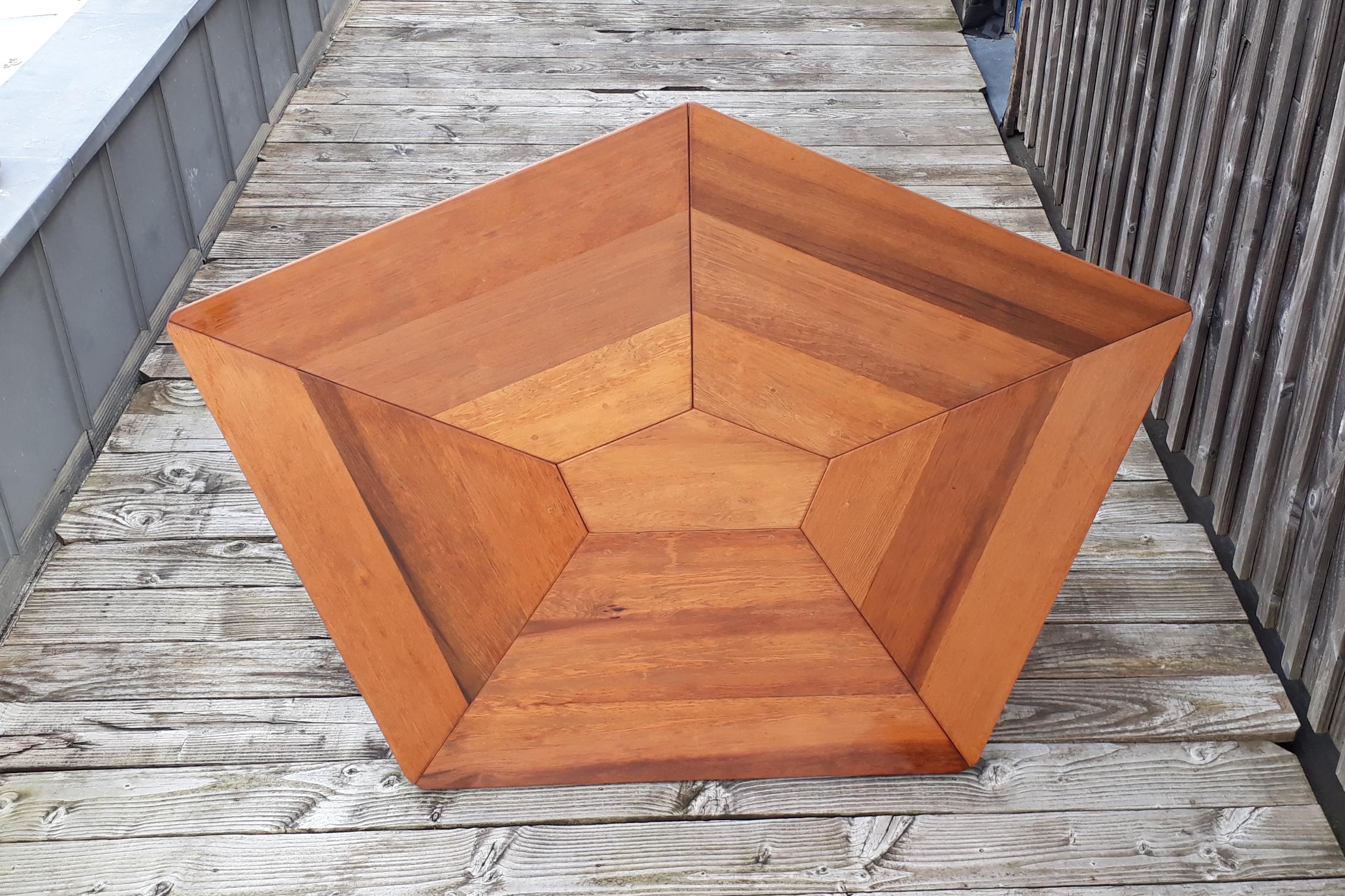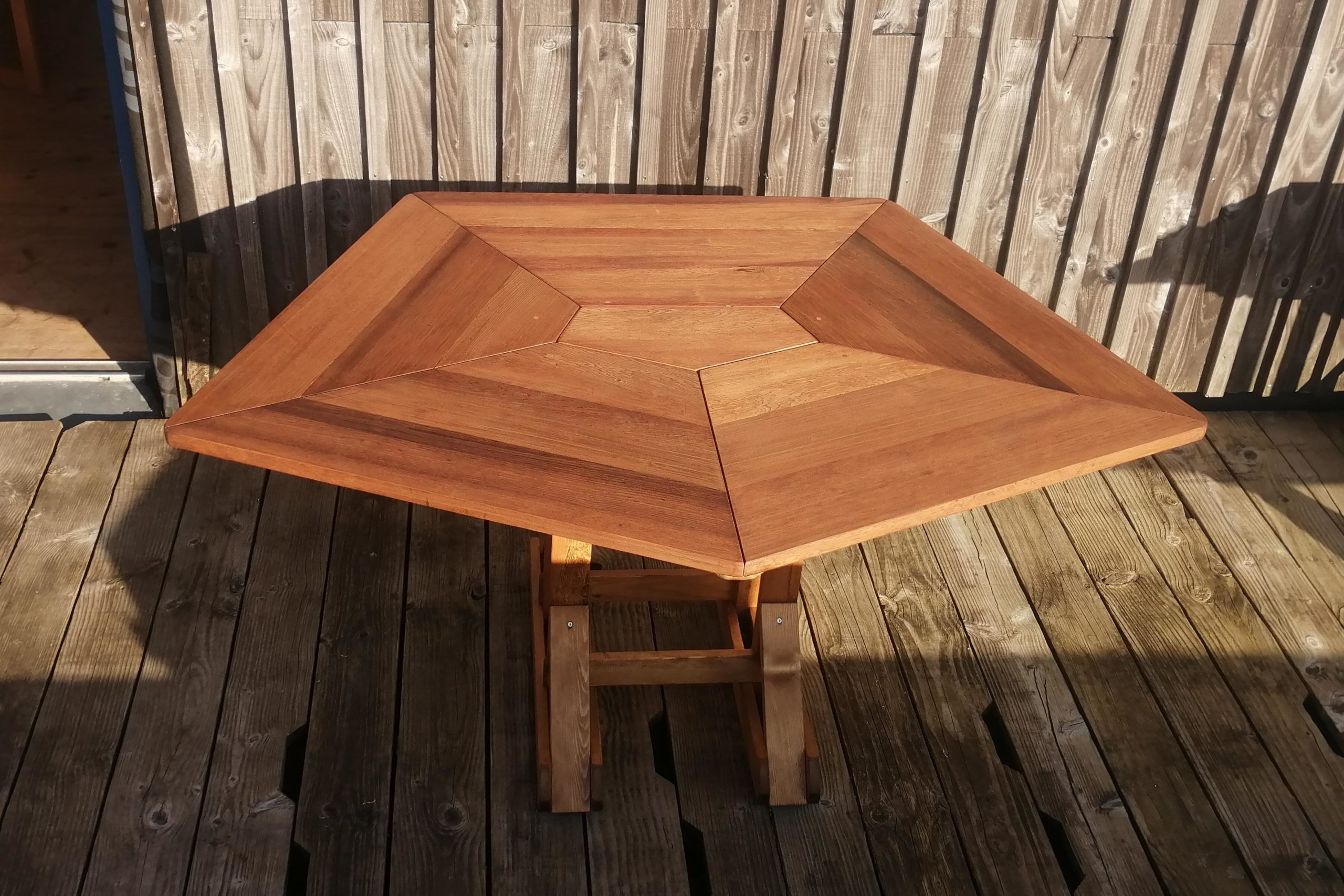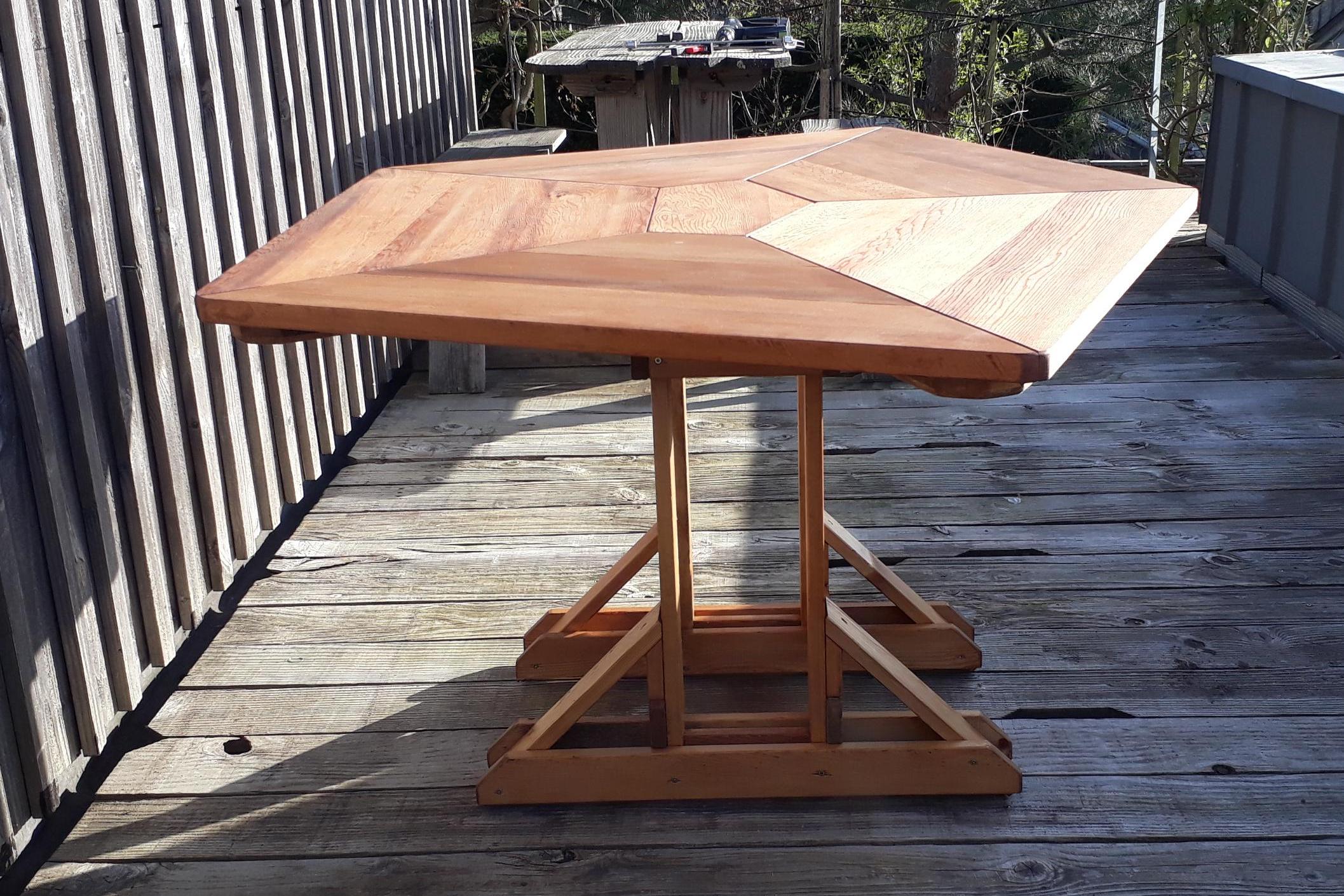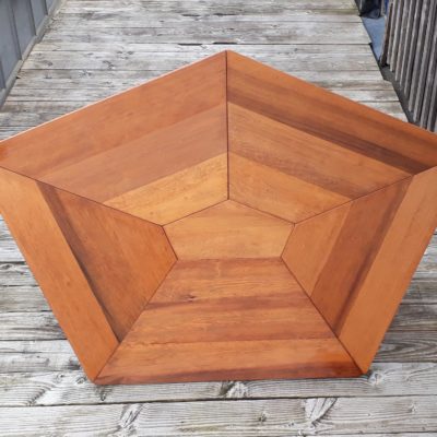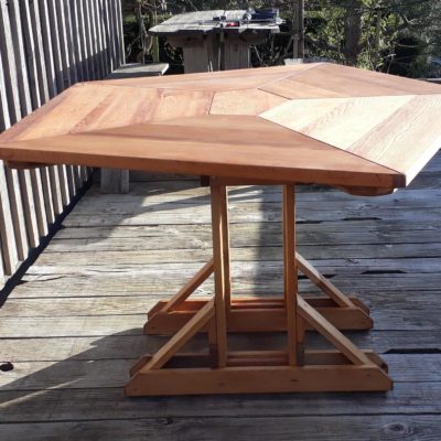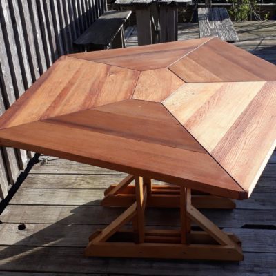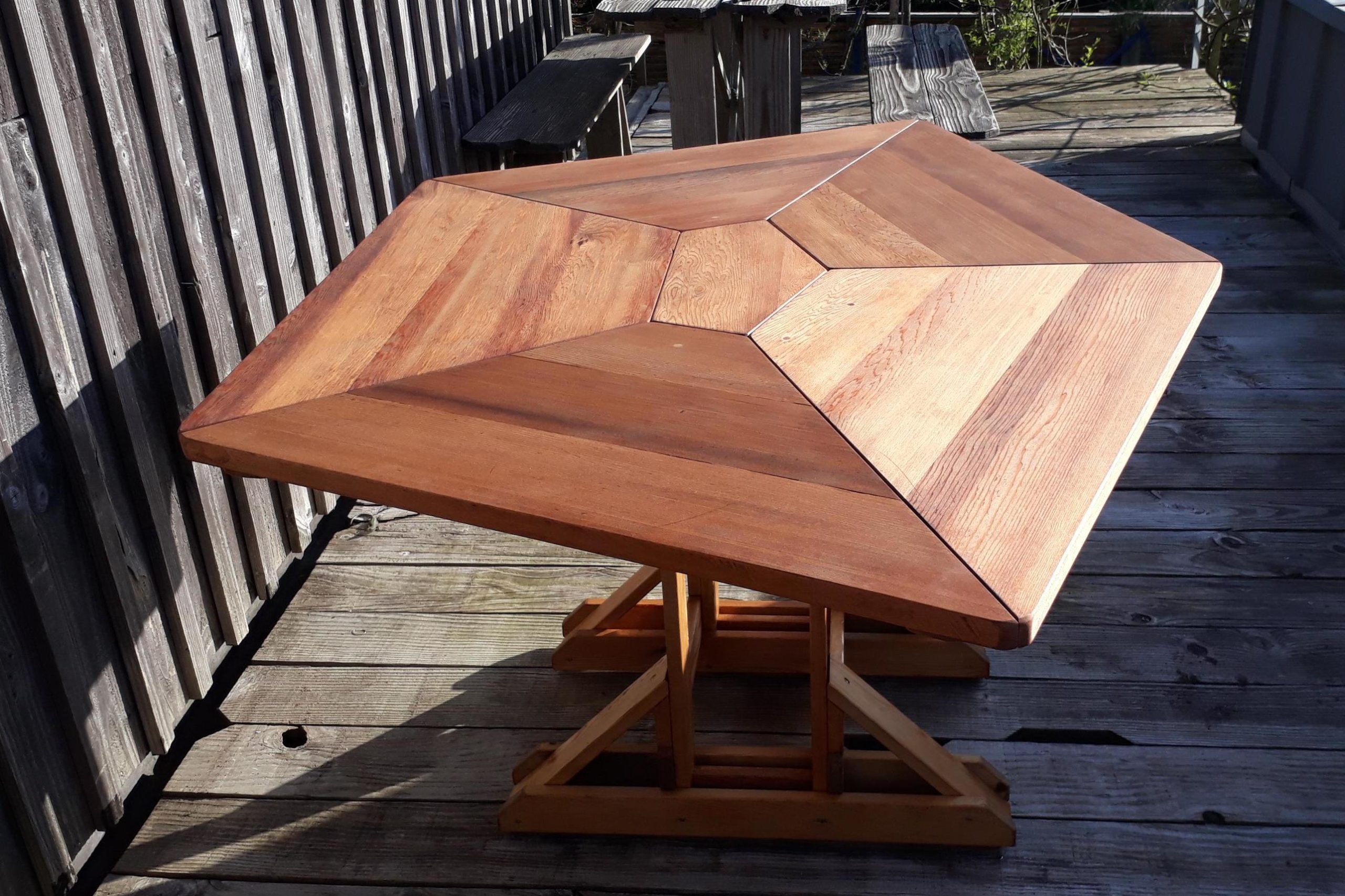 Le pentagone irrégulier permet cinq larges places assises mais il fonctionne aussi très bien pour sept convives. En jouant avec les multiples effets de veinage de ces panneaux de cèdre rouge, la découpe en "toile d’araignée" offre une très grande variété de teintes et de géométries.