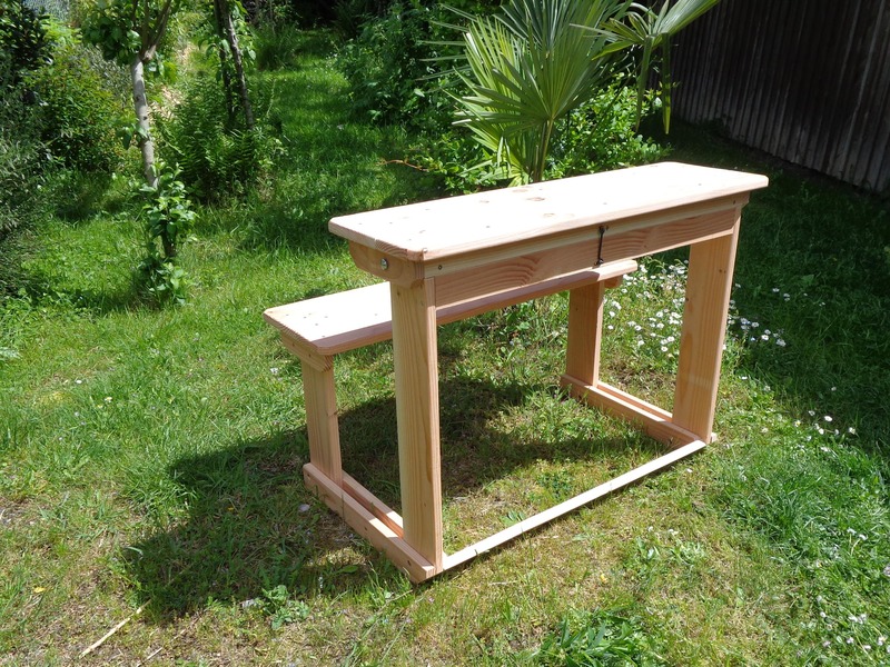 Si on assemble les 2 meubles tête à tête, plateau redressé, on a une large table et 2 bancs en vis à vis pouvant accueillir 6 convives.