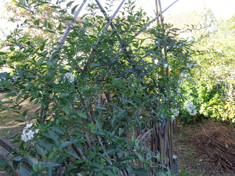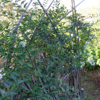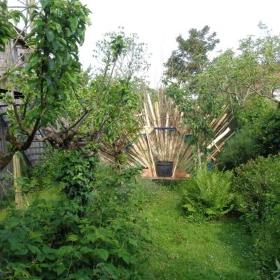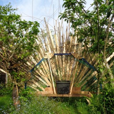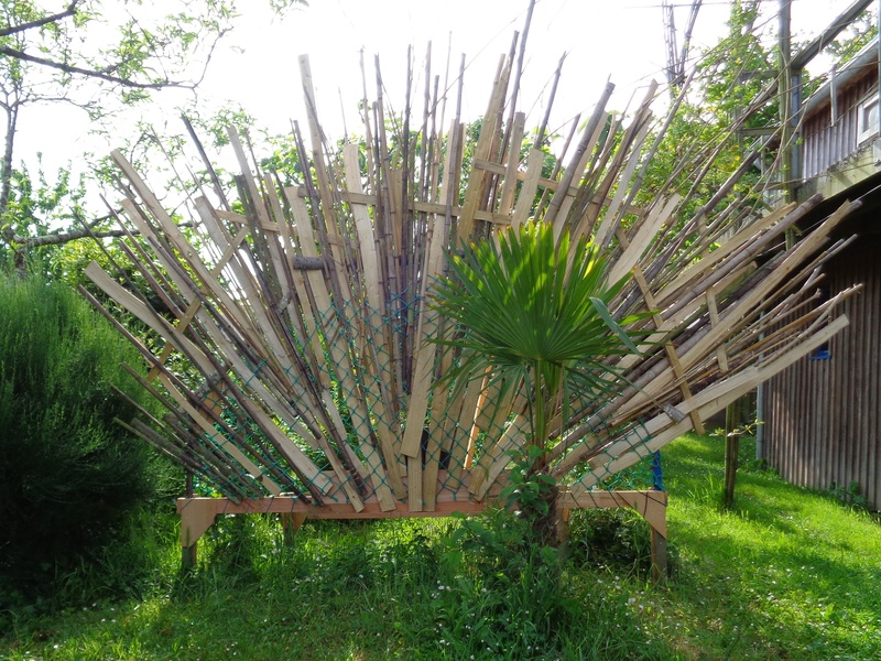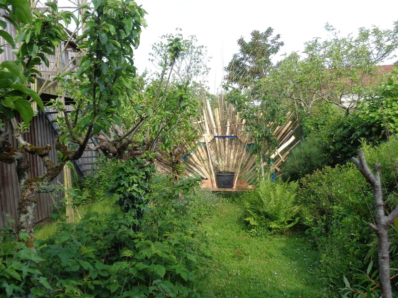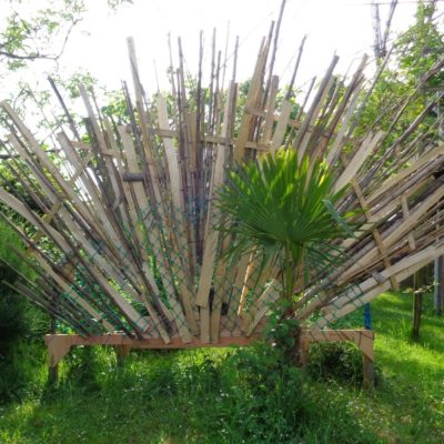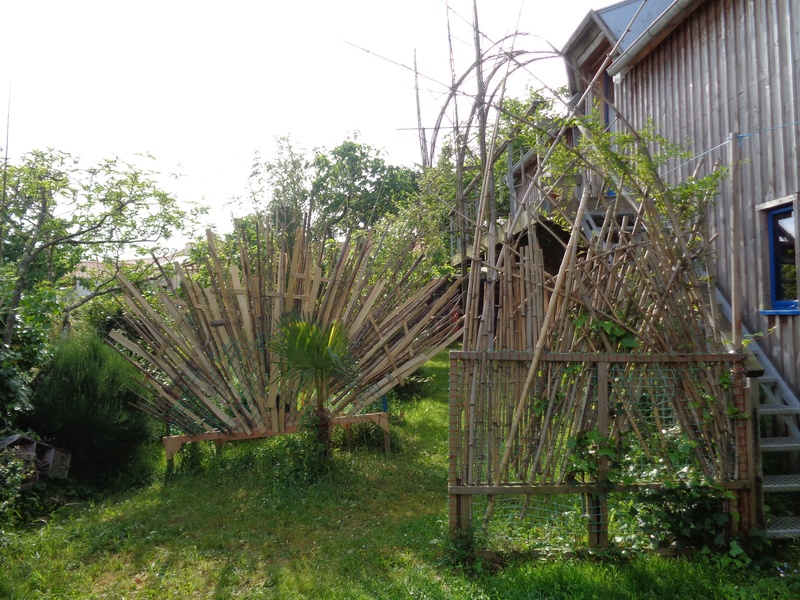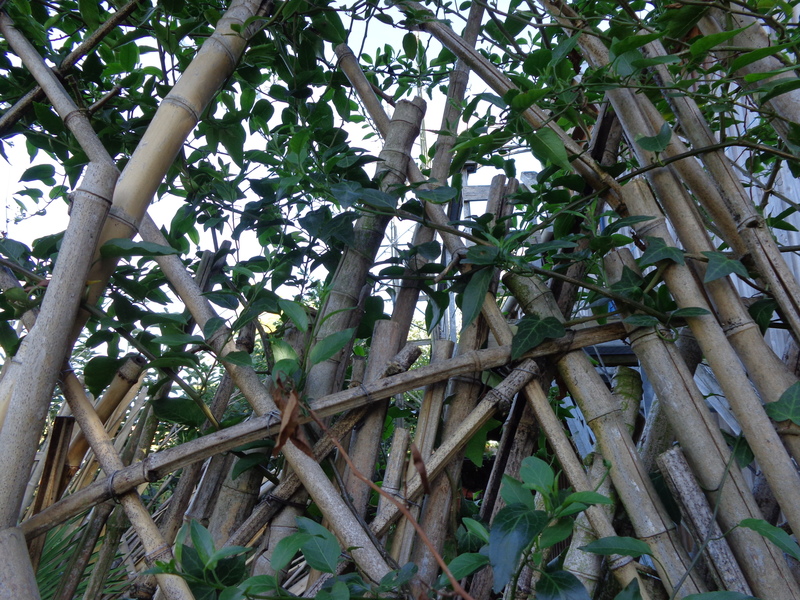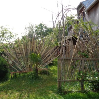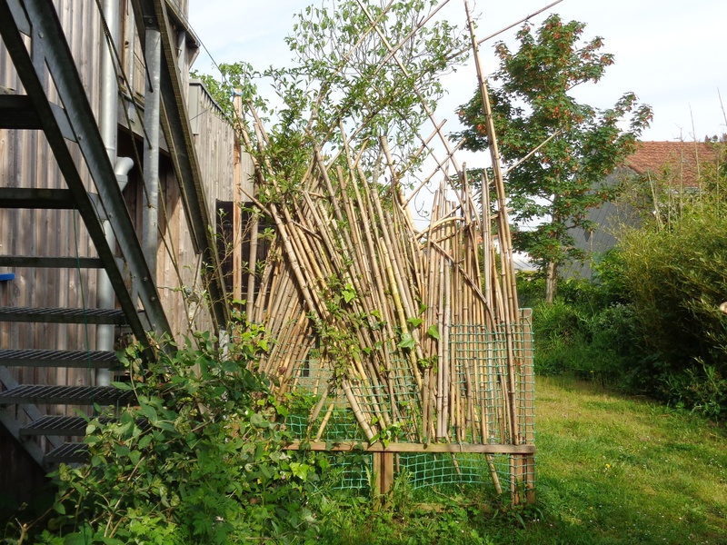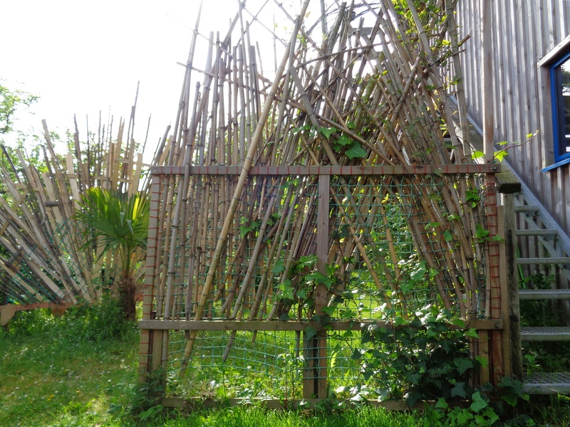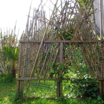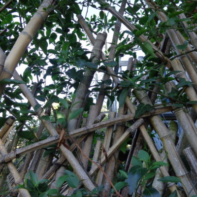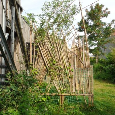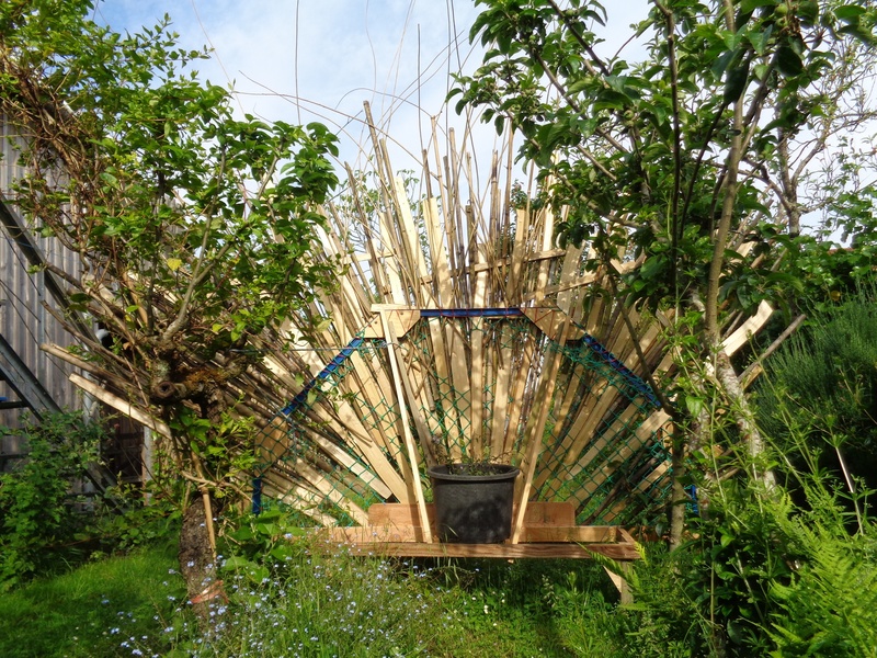 Bambous, lattes de châtaigner, saules, lierre et solanum vivants, filet.