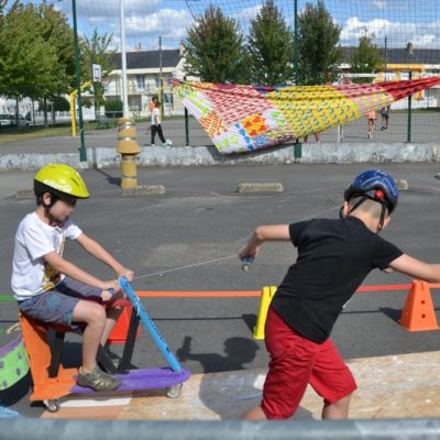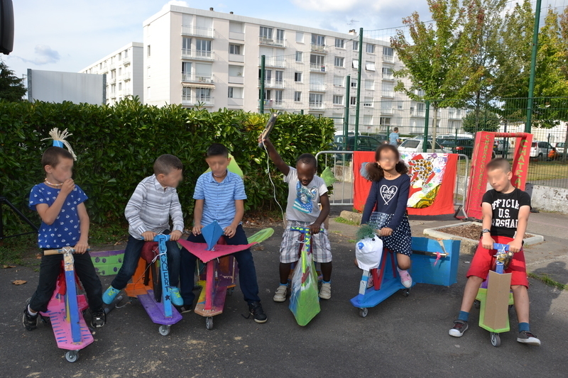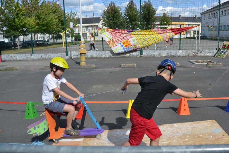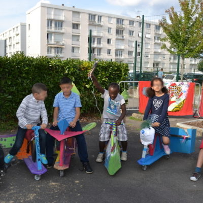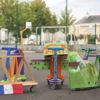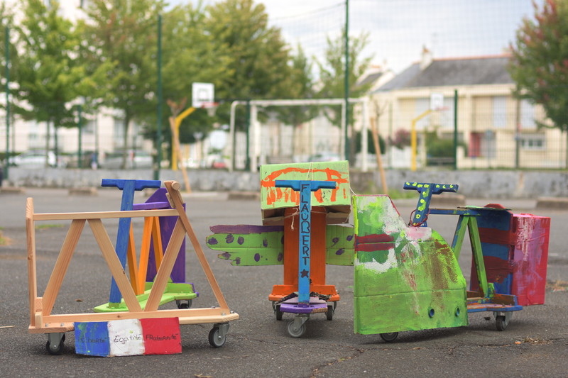 Le "Centre SocioCulturel du Château" est une association de quartier au sud de Nantes qui propose toutes sortes d'activités aux habitants. Pendant l'été, 6 trottinettes en bois identiques ont été mises à disposition des enfants pour être décorées et "customisées" en vue d'une course finale entre équipes.