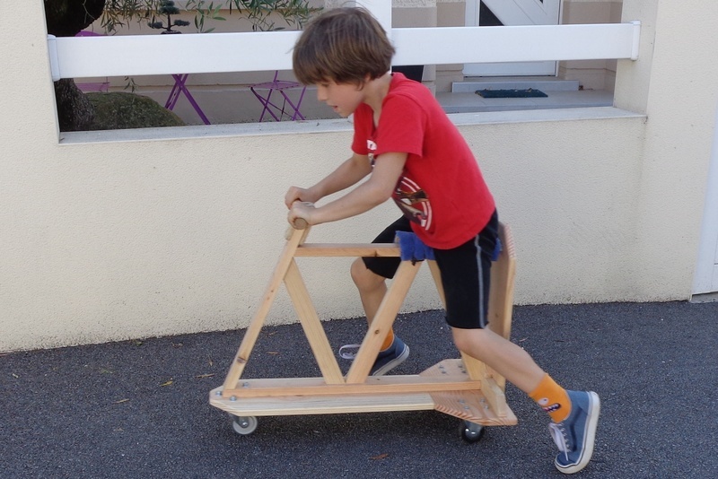 Au départ, le principe était de concevoir 6 "véhicules" identiques destinés aux enfants pour faire une course. La trottinette à 3 roues s'est imposée car elle est stable donc pas dangereuse, tout en procurant des sensations. Elle est solide et peut recevoir toutes sortes de décorations légères et personnalisées. Enfin, on peut y jouer seul ou à plusieurs.
