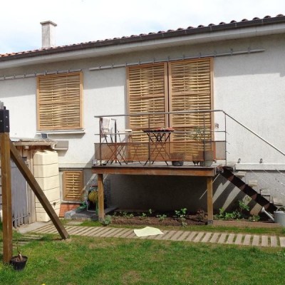 Sur cette petite façade, le fait d'installer de grands volets en bois permet aussitôt de réchauffer les couleurs. Par rapport aux volets classiques type persiennes, les lattes de bambous sont beaucoup plus légères, plus simples à mettre en œuvre et naturellement résistantes aux intempéries sans traitement chimique. Les suspendre à un rail donne un style plus moderne et évite des scellements compliqués pour un amateur.